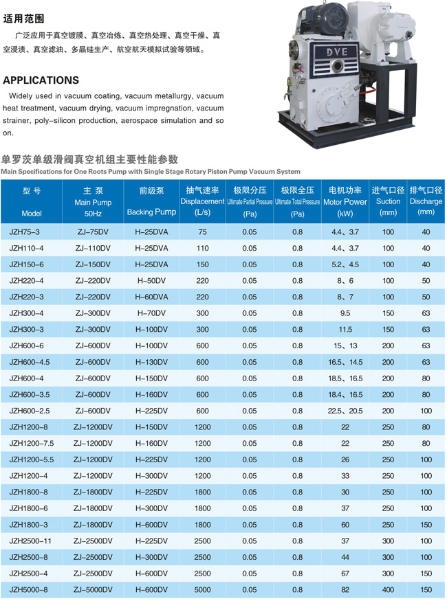 此機(jī)組主要用于需要處理大量水蒸汽,且極限真空度要求較高的抽真空系統(tǒng),例如在真空干燥方面。要求處理大量水蒸汽的真空系統(tǒng)中,使用水環(huán)泵是較合適的,但由于其極限真空度不高,致使整個(gè)機(jī)組的極限真空度較低。雖然在要求真空度較高的抽真空系統(tǒng)中,需要極限真空較高的機(jī)械真空泵作為前級(jí)泵使用。但由于水環(huán)泵的耗電量大,效率很低,噪聲高,在需要長(zhǎng)時(shí)間的真空干燥系統(tǒng)中,用水環(huán)泵作為羅茨泵前級(jí)泵很不經(jīng)濟(jì)。